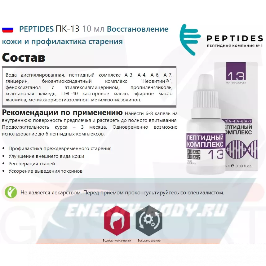 Пептидный комплекс для кожи. Содержит пептиды – сосудов, хрящей, тимуса, печени.