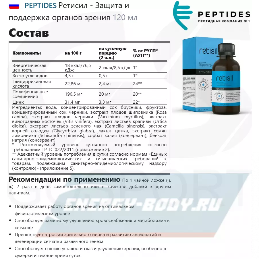 Ингредиенты: вода, концентрированный сок брусники, фруктоза, концентрированный сок черники, экстракт плодов шиповника (Rosa canina), экстракт плодов черники (Vaccinium myrtillus), экстракт виноградных косточек (Vitis vinifera), экстракт листьев крапивы (Urtica dioica), экстракт листьев зеленого чая (Camellia sinensis), экстракт корней солодки (Glycyrrhiza glabra), лактат цинка, экстракт семян лимонника (Schisandra chinensis), сорбат калия (консервант), бензоат натрия (консервант).