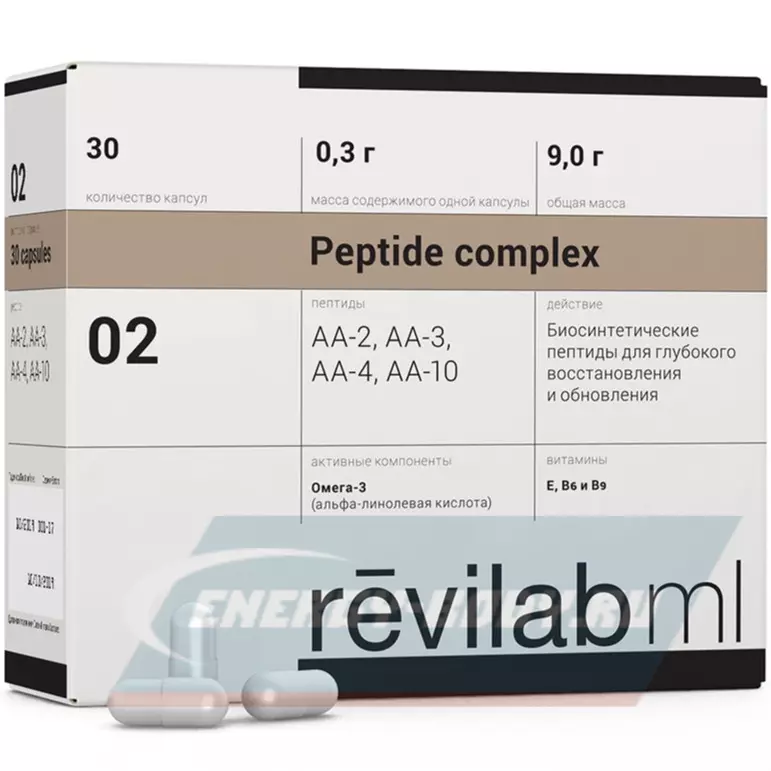 Ингредиенты: МКЦ (носитель), капсула ((гидроксипропилметилцеллюлоза (носитель), геллановая камедь (стабилизатор)), полиненасыщенные жирные кислоты омега-3 (альфа-линолевая кислота, содержит носитель сорбит и мальтодекстрин), лактоза (наполнитель), смесь токоферолов (витамин Е), пептидный комплекс АА-3 (дипептид состоящий из L-лизина и L-глутаминовой кислоты), пептидный комплекс АА-2 (трипептид, состоящий из L-глутаминовой кислоты, L-аспарагиновой кислоты и L-пролина), пептидный комплекс АА-10 (трипептид состоящий из L-глутаминовой кислоты, L-аспарагиновой кислоты и L-лейцина), стеарат кальция (антислеживатель), диоксид кремния (антислежива тель), пиридоксина гидрохлорид (витамин В6), пептидный комплекс АА-4 (гептапептид состоящий из L-серина, L-аланина, L-глутаминовой кислоты, L-глутаминовой кислоты, L-лизина, L-глутаминовой кислоты и L-аланина), фолиевая кислота (витамин В9).