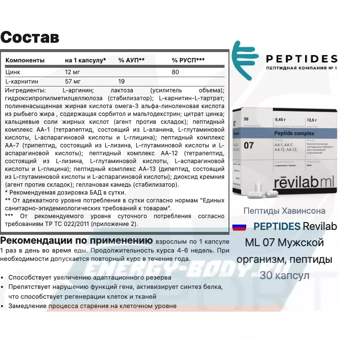 Пептидные комплексы эпифиза, сосудистой стенки, семенников, мочевого пузыря, полиненасыщенные жирные кислоты омега-3, L-карнитин, цинка цитрат.