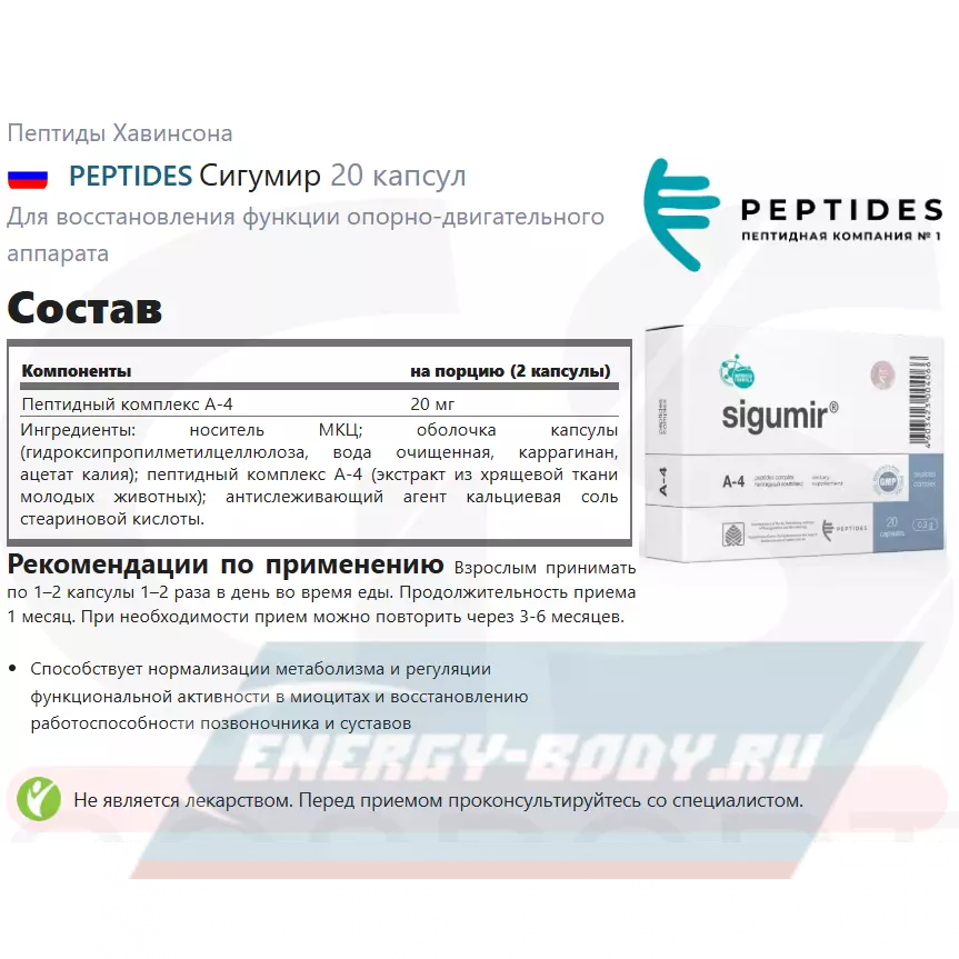 PEPTIDES Сигумир (Sigumir) 20 капсул — Для восстановления функции опорно-двигательного аппарата