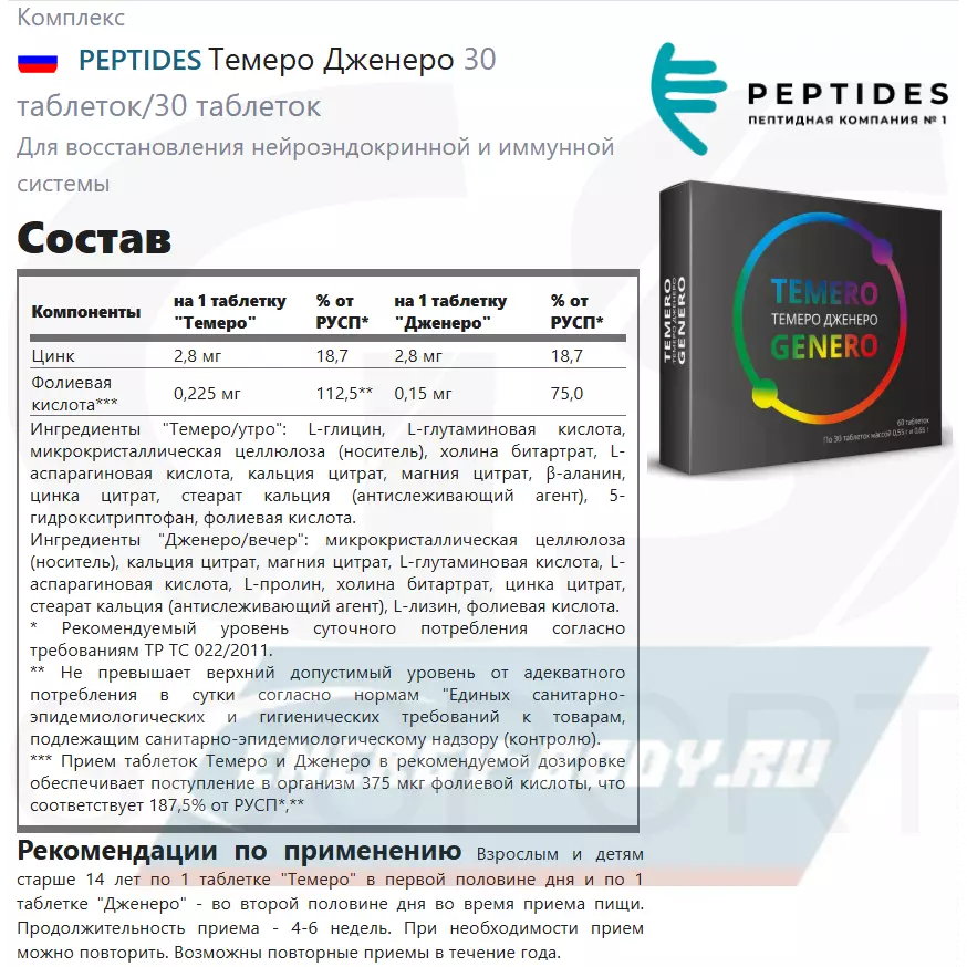 Для поддержки оптимальной функциональной активности регуляторных систем организма нейроэндокринной и иммунной, а также для общей биорегуляции организма, в том числе на аутокринном уровне, компания Peptides разработала инновационное средство «Темеро Дженеро». Это два взаимодействующих активных препарата, представляющих собой бустер основных аминокислот организма, запускающих его работу на эпигеномном клеточном уровне.