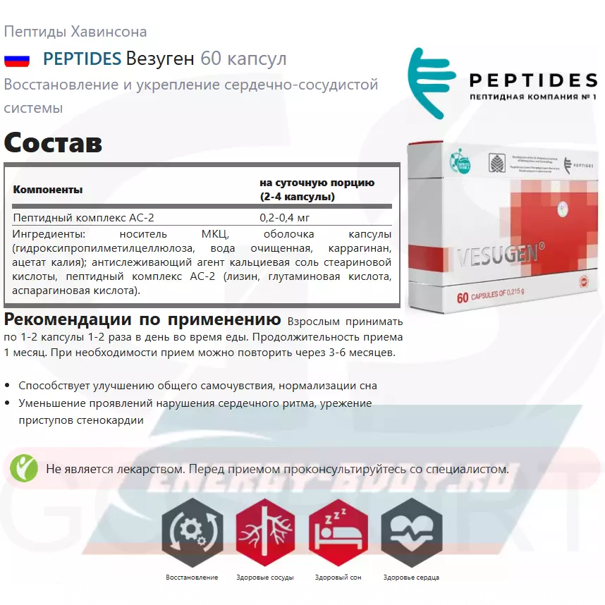 PEPTIDES Везуген (Vesugen) 60 капсул — Восстановление тканей и нормализация состояния сосудов