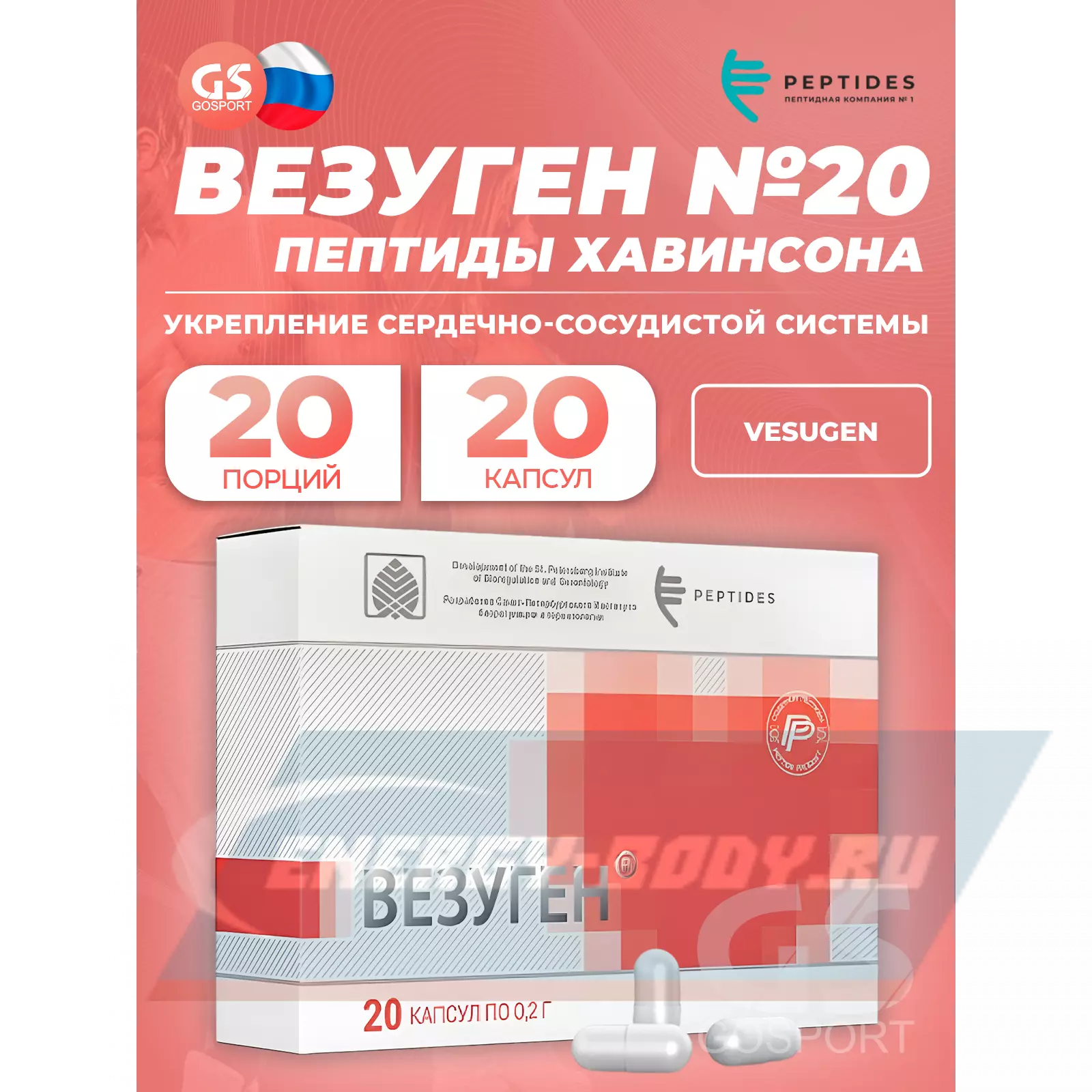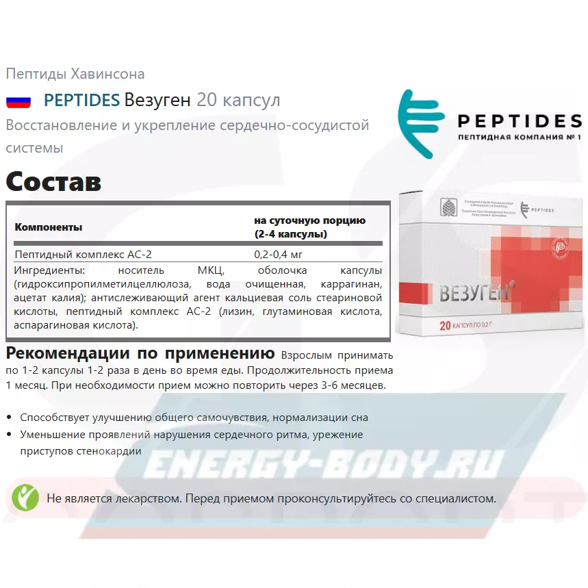 PEPTIDES Везуген (Vesugen) 20 капсул — Восстановление тканей и нормализация состояния сосудов