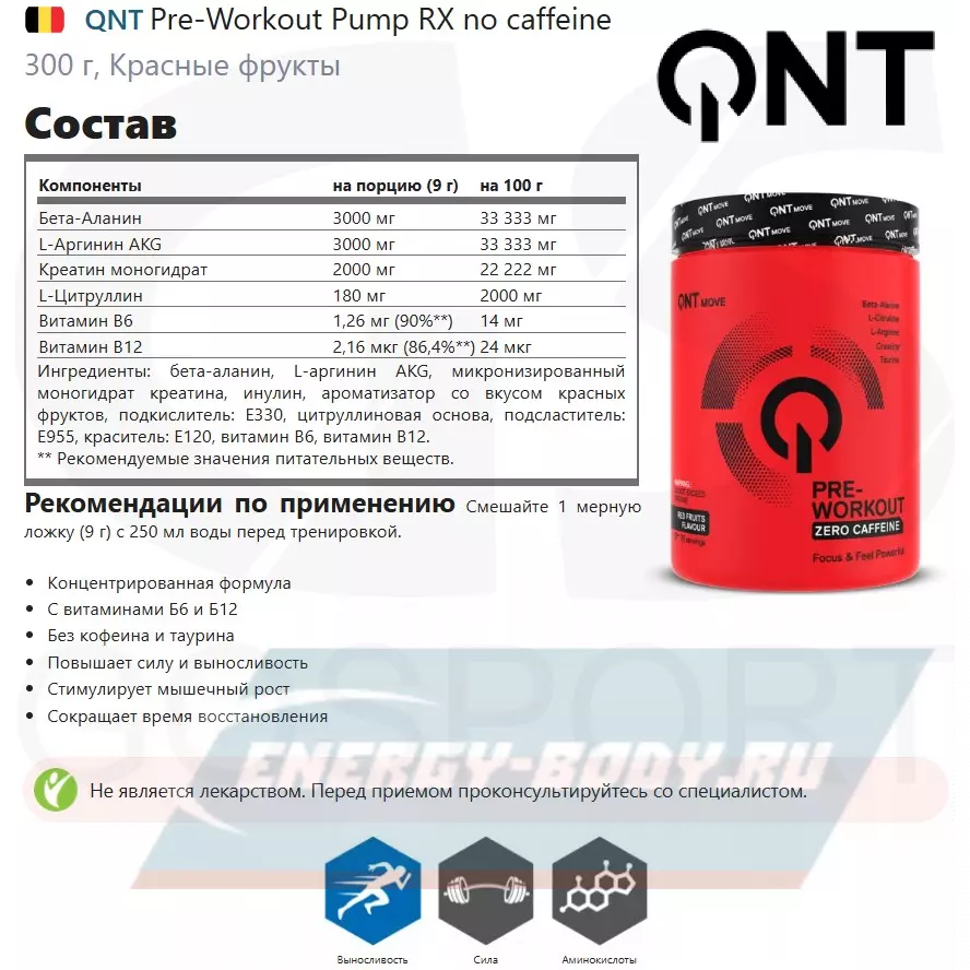 Предтренировочный комплекс Pre-Workout Pump RX от QNT помогает продвинуться в тренировках на новый уровень. Его улучшенная формула создает условия для повышения общей производительности организма, для продуктивного мышечного роста, для эффективного послетренировочного восстановления.