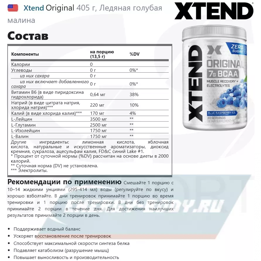 Комплекс Xtend SCIVATION является одним из лучших восстановительных комплексов ВСАА. Данный продукт это комплекс ВСАА аминокислот, которые обладают ярко выраженными анаболическими способностями. В состав входят такие эффективные составляющие как ВСАА, Глютамин, пиридоксин, цитруллин.