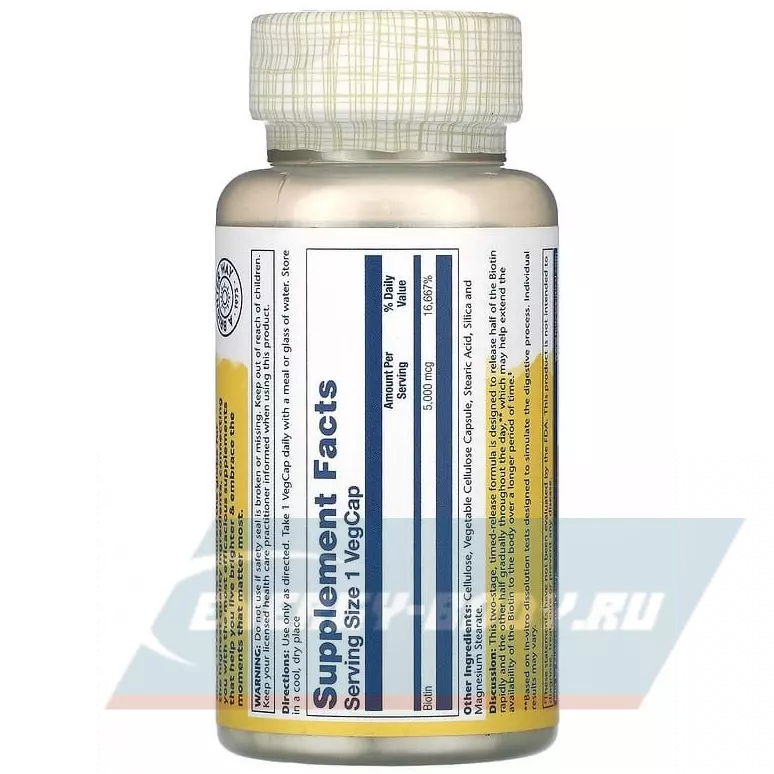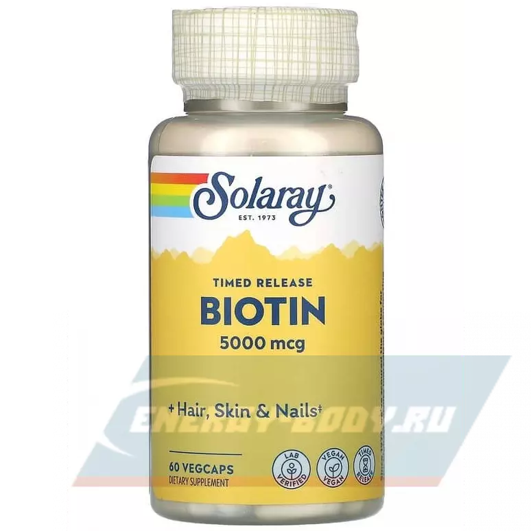 Выглядите и чувствуйте себя лучше с отмеченным наградами Solaray Biotin 5000 mcg. Биотин, также известный как витамин B-7, является одним из восьми важных витаминов комплекса B. Биотин поддерживает производство энергии; играет роль во многих метаболических функциях нашего организма; и помогает питать здоровые волосы, кожу и ногти. Поскольку биотин не синтезируется организмом, мы должны получать его с пищей или добавками. Одна капсула содержит 5000 мкг биотина.