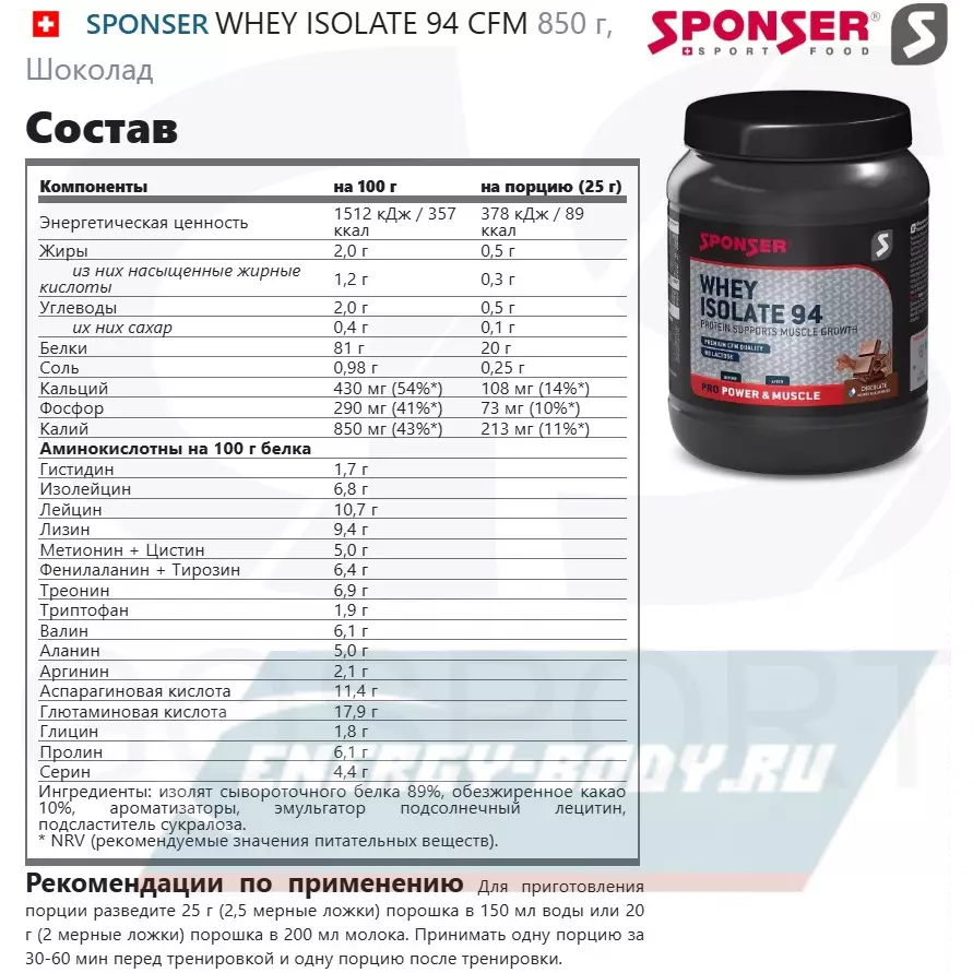 Состав SPONSER WHEY ISOLATE 94 CFM