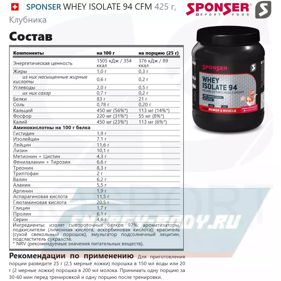 Состав SPONSER WHEY ISOLATE 94 CFM