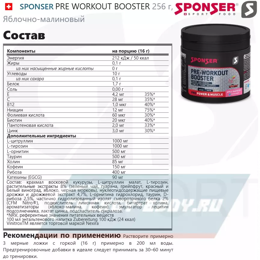 Специалисты фирмы Sponser задумались и создали именно такой продукт - «ПреВоркаут Бустер». Благодаря сложному многокомпонентному составу напитка Ваш организм будет идеально готов к любым физическим нагрузкам.