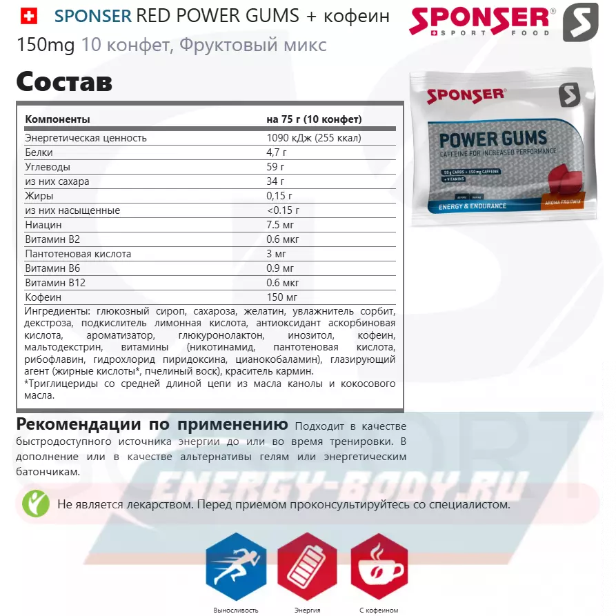 Состав SPONSER RED POWER GUMS + кофеин 150mg