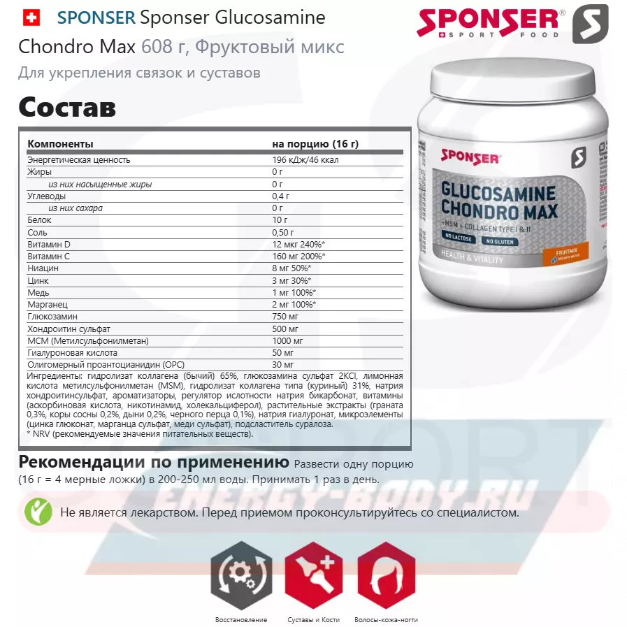 Sponser Glucosamine Chondro Max 608 г, Фруктовый микс