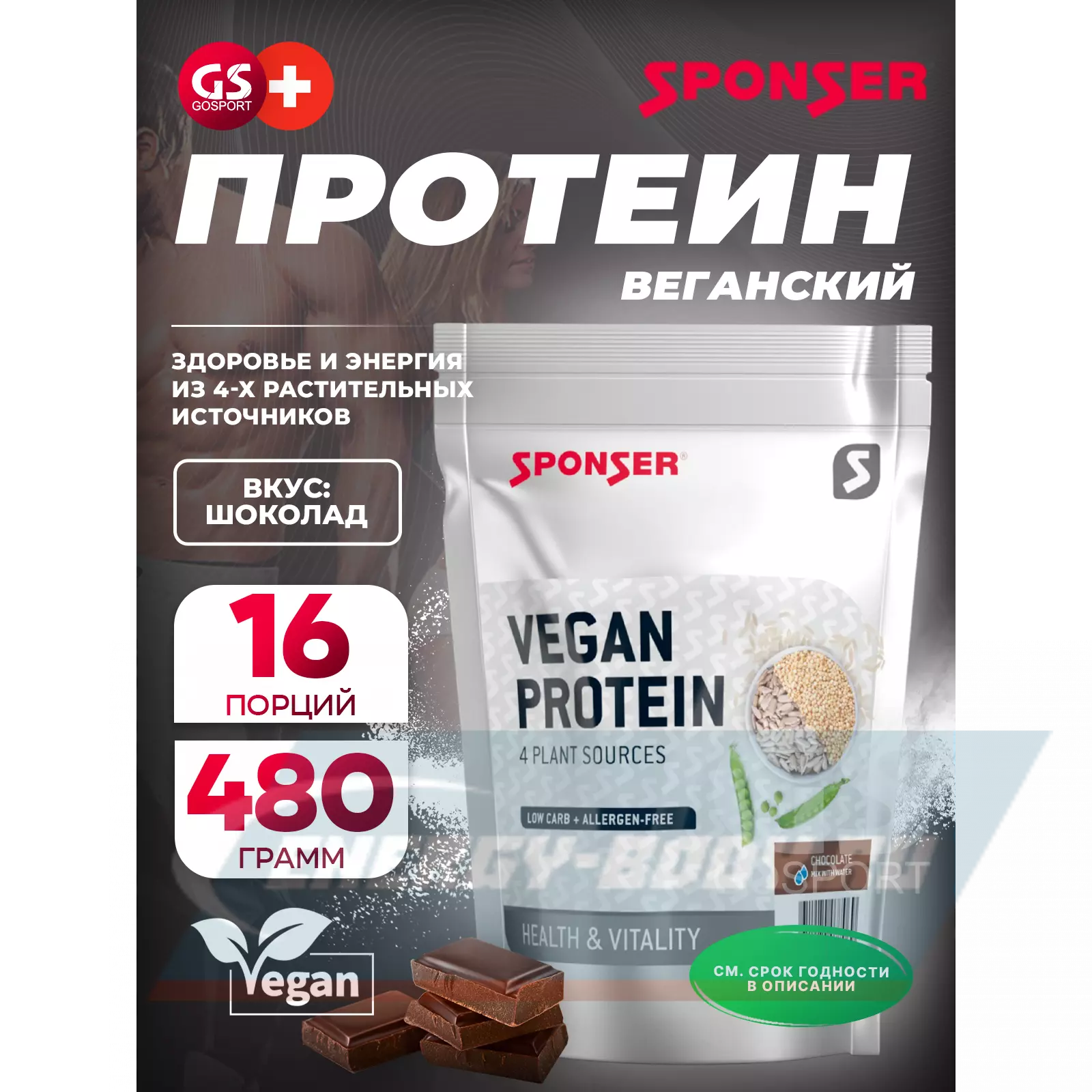 Vegan Protein Sponser – вегетарианский протеин спонсер на основе комплекса растительных белков, полученных из гороха, риса, нута и семян подсолнечника. С добавлением пищевых дрожжей (источник аминокислот). С высоким содержанием пищевых волокон. С подсластителем (сукралоза), с шоколадным вкусом. Комбинация четырёх растительных белков обеспечивает протеину оптимальный аминокислотный профиль.