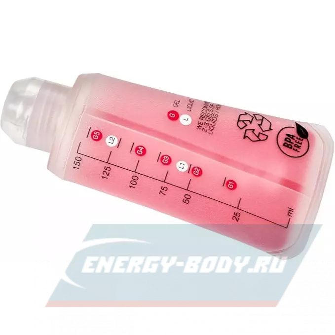 - Объём фляги составляет 150 мл, что позволяет вместить чуть более 5 пакетиков густых гелей или более 2 пакетиков жидких гелей Squeezy.