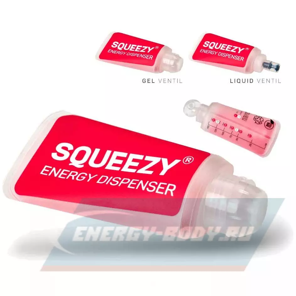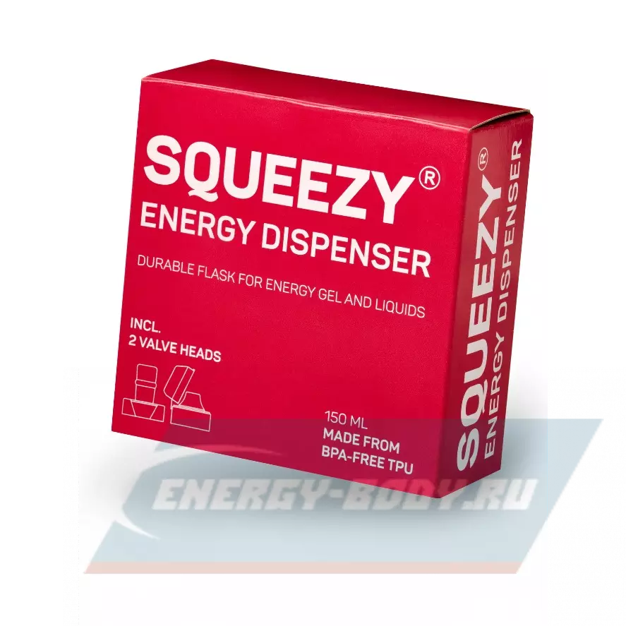 Energy dispenser оснащен двумя колпачками: колпачком с прикусом, идеально подходящим для жидких гелей, и колпачком с клапаном для более густых гелей.