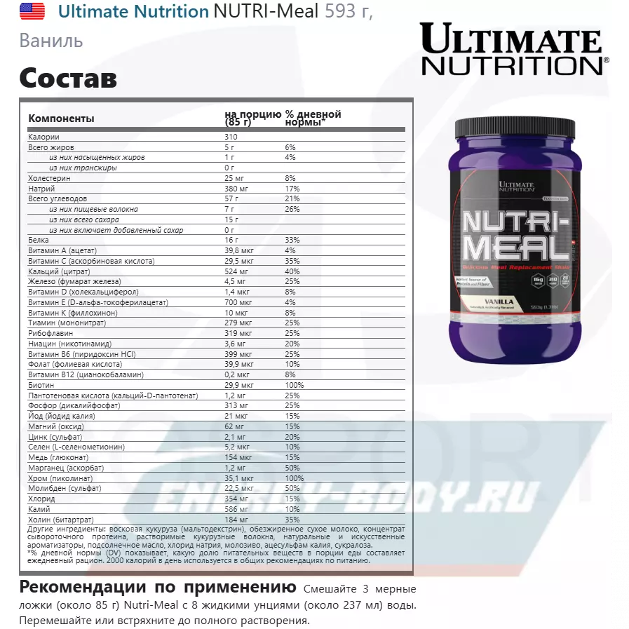 NutriMeal от Ultimate Nutrition содержит концентраты сывороточного протеина с многочисленными преимуществами для здоровья, включая противомикробные и противовирусные свойства, иммуностимулирующие факторы, поддержку здоровья костей, повышенную антиоксидантную способность и повышенную физическую работоспособность.