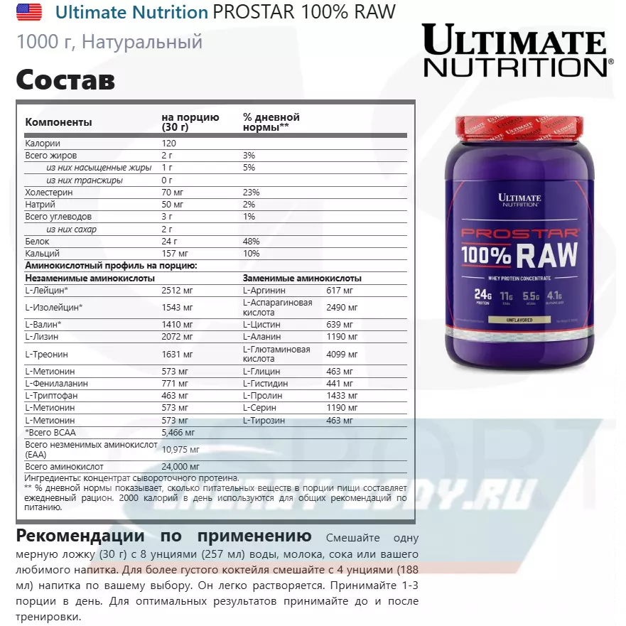 Ultimate Nutrition PROSTAR 100% RAW 1000 г, Натуральный — для набора мышечной массы и восстановления