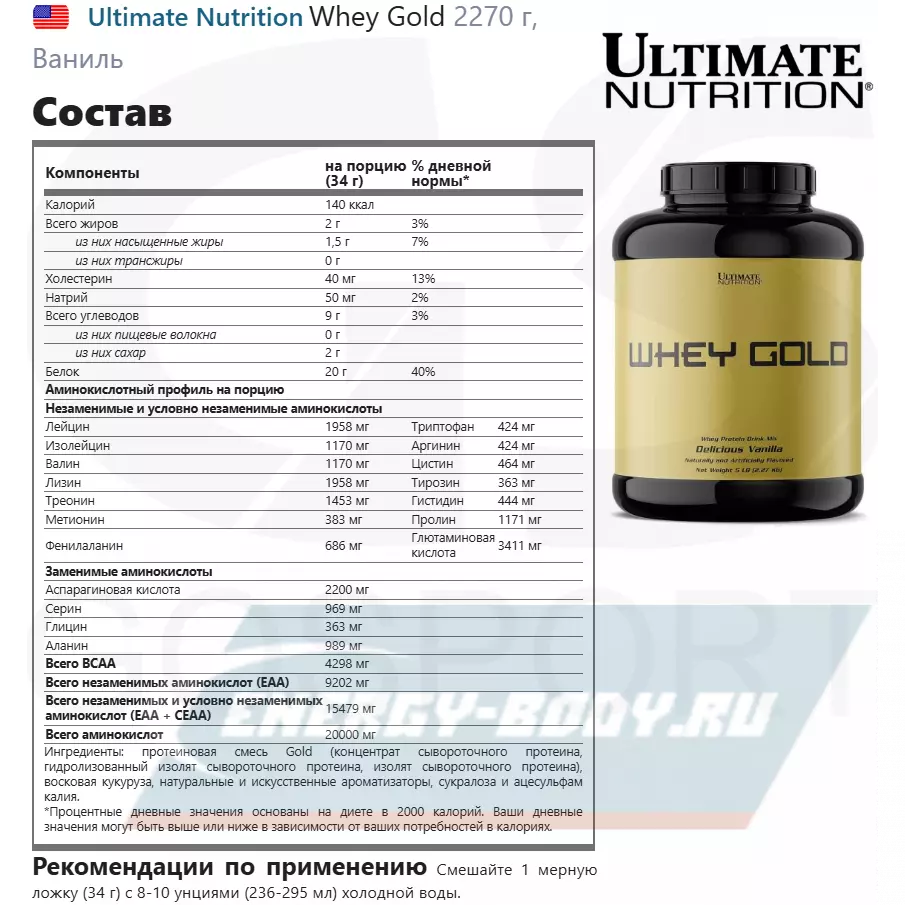 Протеин Whey Gold от Ultimate Nutrition – источник ценнейшего сывороточного белка, представленного в 3-х разных формах: концентрата, изолята и гидролизата. Основной задачей протеина – предоставление аминокислот организму, участие которых в белковом синтезе является ключевой в построении мышечной массы и процессах ее восстановления. Также сывороточный белок является идеальным инструментом по борьбе с катаболизмом, из-за свой высокой скорости и степени усвоения.