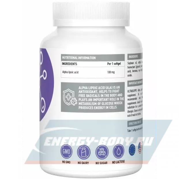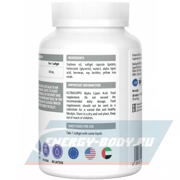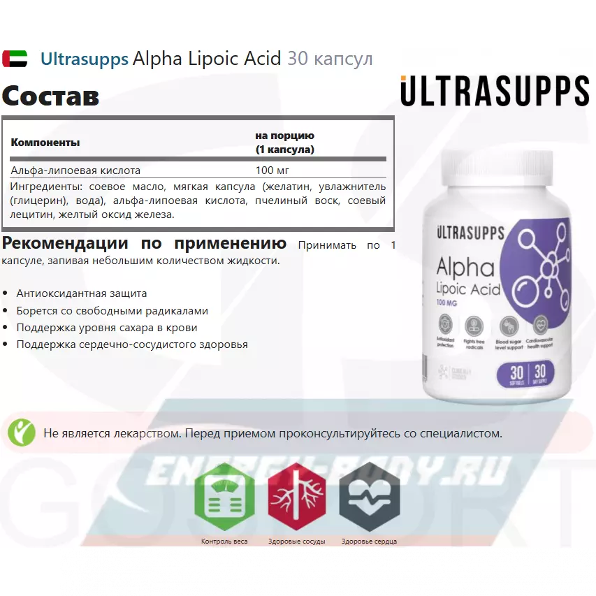 АЛК помогает также в коррекции веса и его поддержании на оптимальном уровне. Её принимают для нормализации процессов метаболизма и снижения уровня глюкозы в крови. С возрастом самостоятельная выработка кислоты снижается и становится актуальным прием дополнительного количества альфа-липоевой кислоты в форме бад. Недостаток АЛК увеличивает риск повреждения клеток токсинами, провоцирует нарушение углеводного обмена и накопление жировой ткани. Альфа-липоевая кислота от Ultrasupps — это оптимальная дозирвка в одной капсуле.