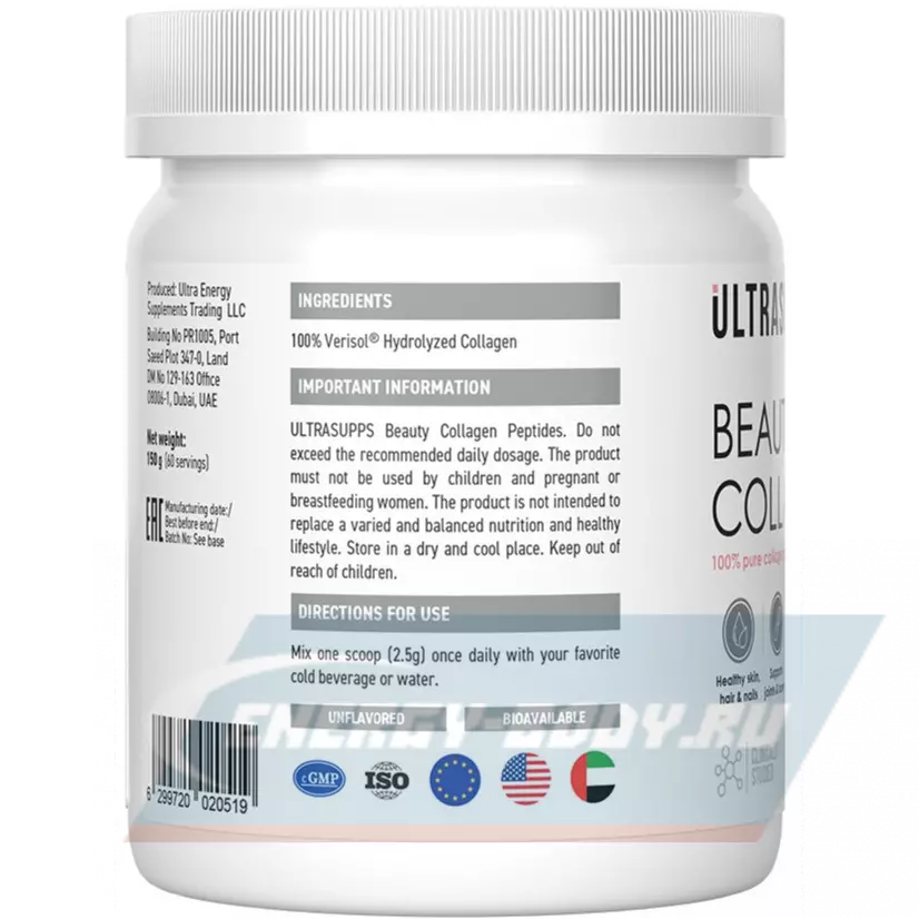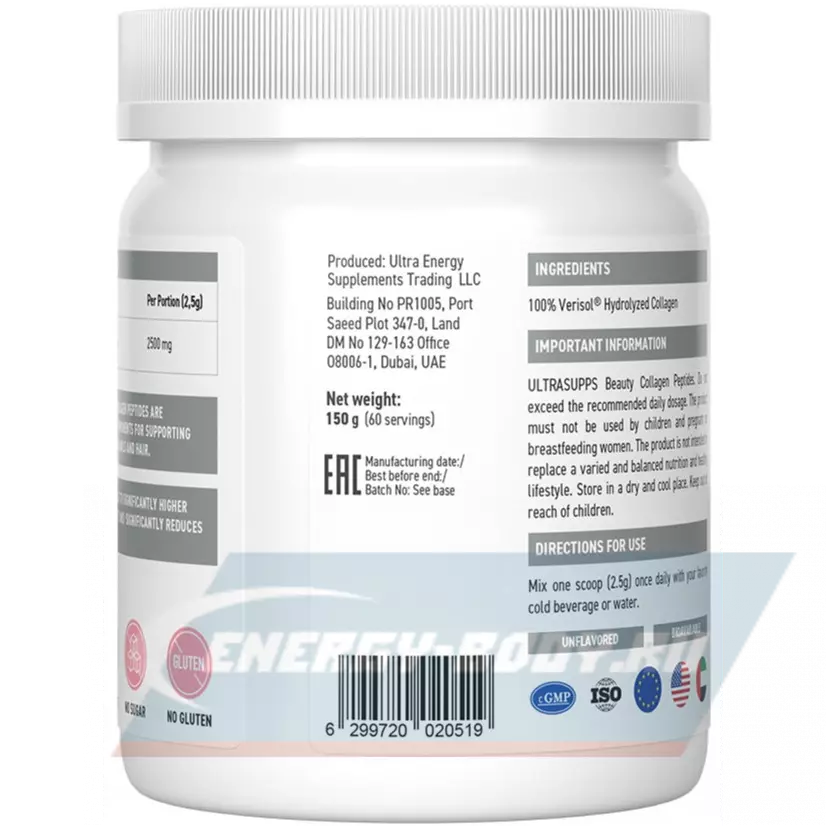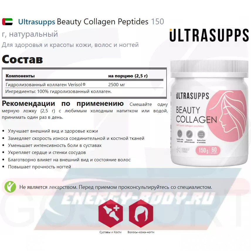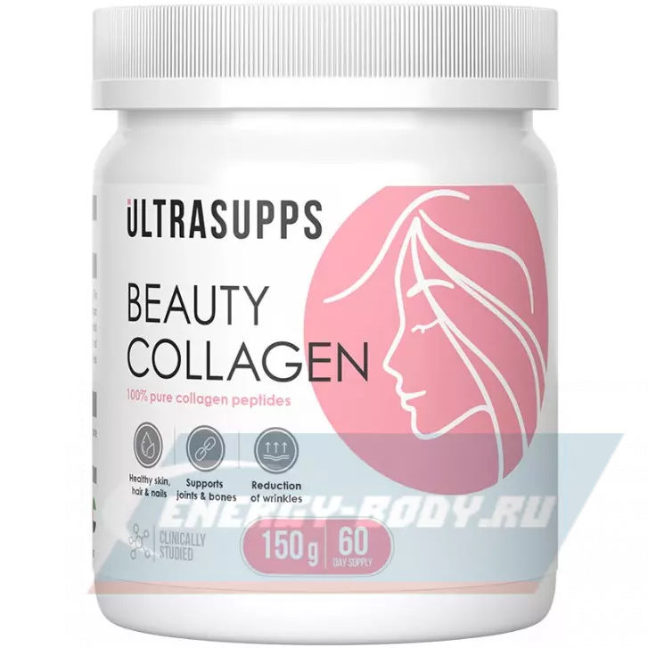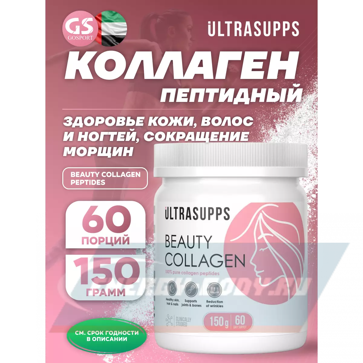 Коллаген Ultrasupps Beauty Collagen Peptides 150 г - биоактивная пищевая добавка для здоровья и красоты вашей кожи, волос и ногтей. Коллаген - необходимый соединительным тканям организма строительный белок, основной структурный протеин. С возрастом и под воздействием различных негативных факторов самостоятельная выработка организмом коллагена снижается и становится актуальной внешняя поддержка. Коллаген Ultrasupps не содержит лишних ингредиентов, ароматизаторов, красителей и имеет высокую биодоступность. Он способствует естественной красоте и молодости кожи, волос и ногтей, здоровью зубов, суставов и сухожилий. Продукт разработан для женщин, которые ориентированы на природную защиту от преждевременного старения.