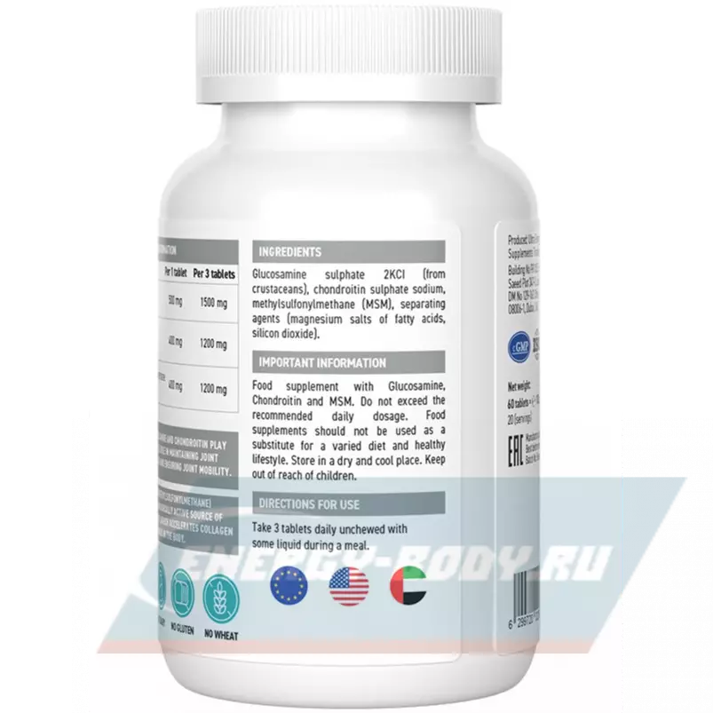 Ингредиенты: глюкозамина сульфат 2KCI (из ракообразных), хондроитин сульфат натрия, метилсульфонилметан (МСМ), разделяющие агенты (магниевые соли жирных кислот, диоксид кремния).