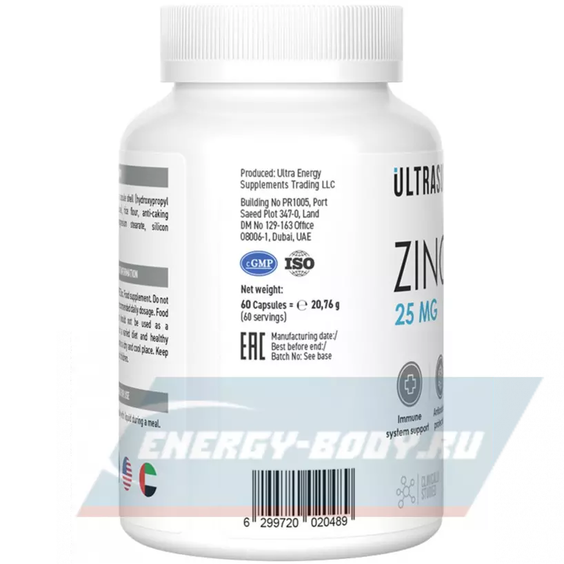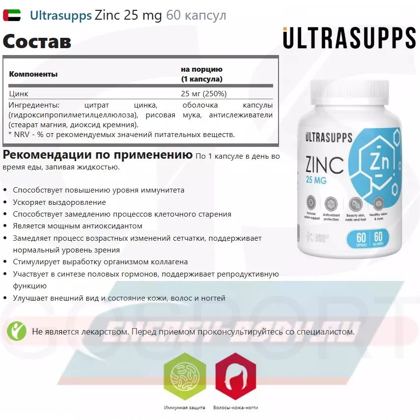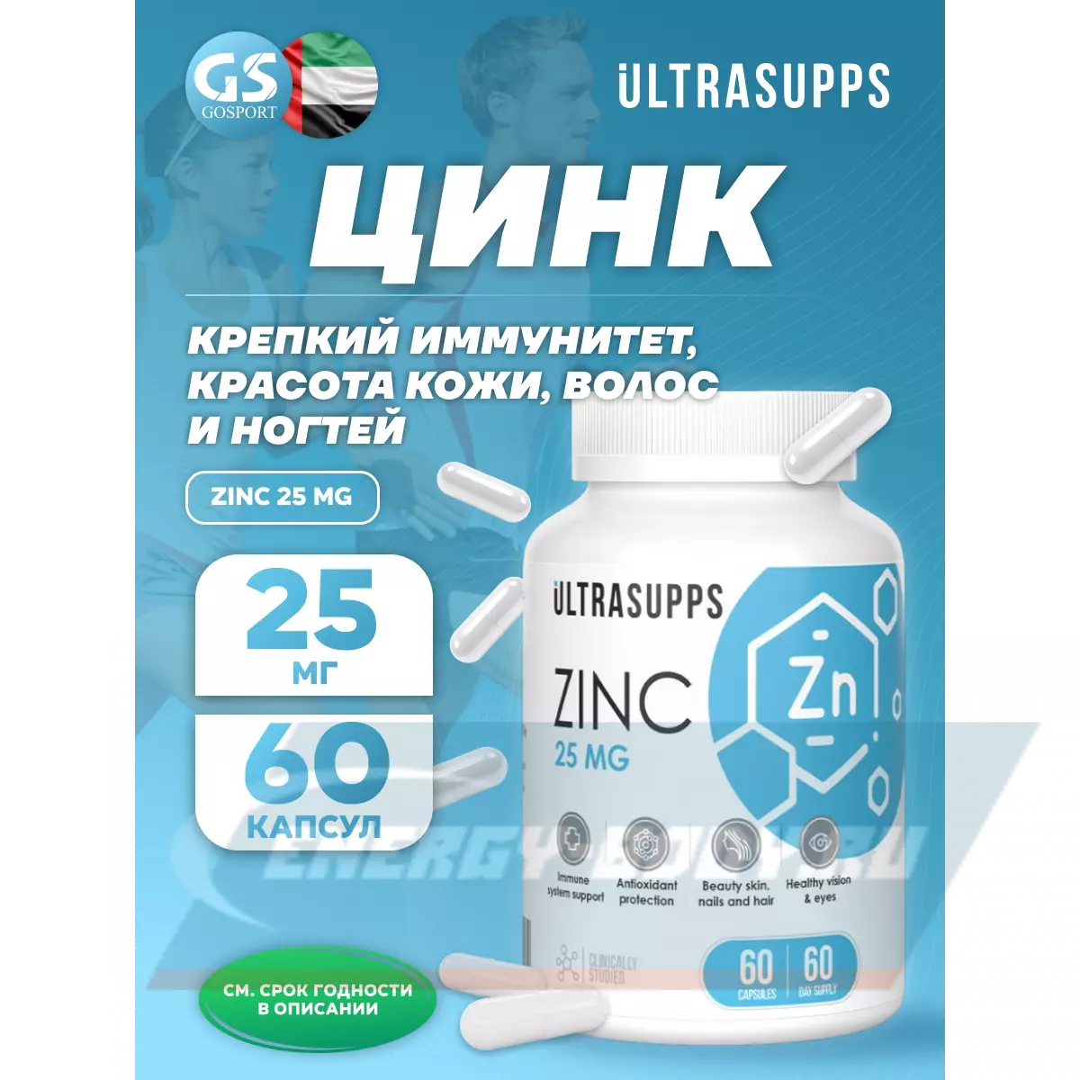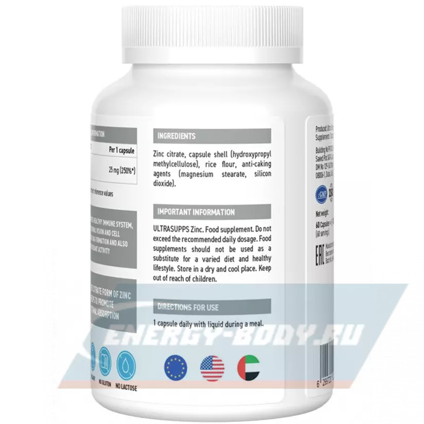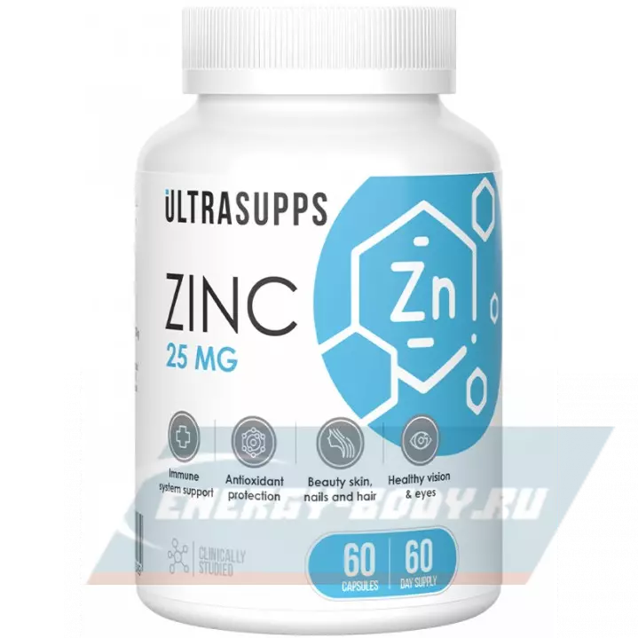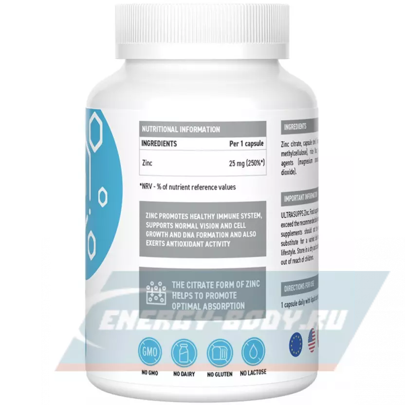 Ultrasupps Zinc — биодобавка на основе цитрата цинка, одного из наиболее важных для здоровья минералов. Цитратная форма цинка органична и наиболее биодоступна, поэтому микроэлемент будет хорошо усваиваться организмом. Ultrasupps Цинк содержит оптимальную дозировку цинка для покрытия суточной потребности в нем. Цинк необходим для активной работы иммунной системы, для здоровья кожи, волос и ногтей, он является антиоксидантом и задействован во многих жизненно важных процессах организма. Также цинк стимулирует синтез белков, коллагена и кератина, обеспечивает правильный рост и деление клеток, регулирует работу сальных желез и способствует регенерации поврежденных тканей.
