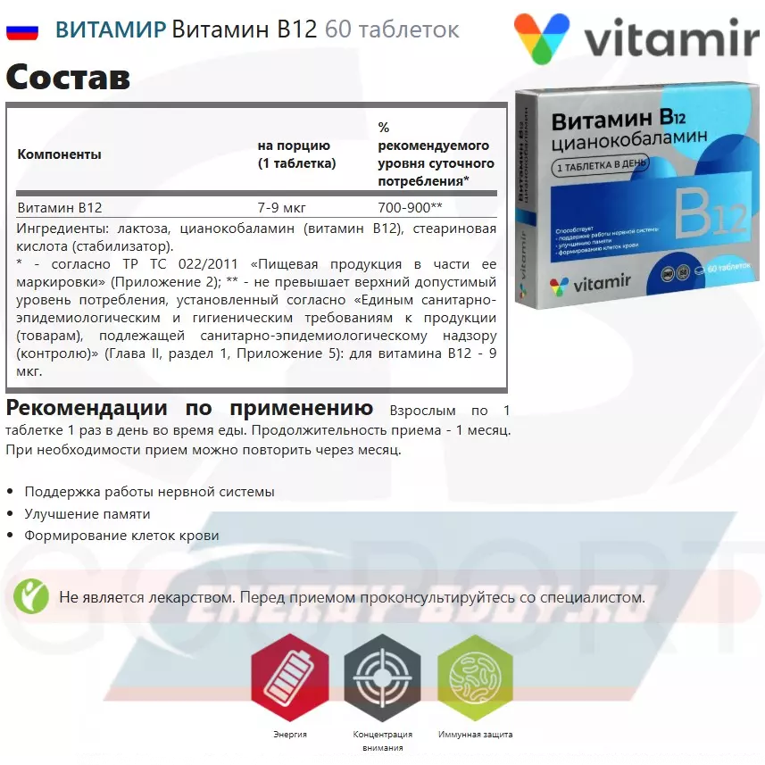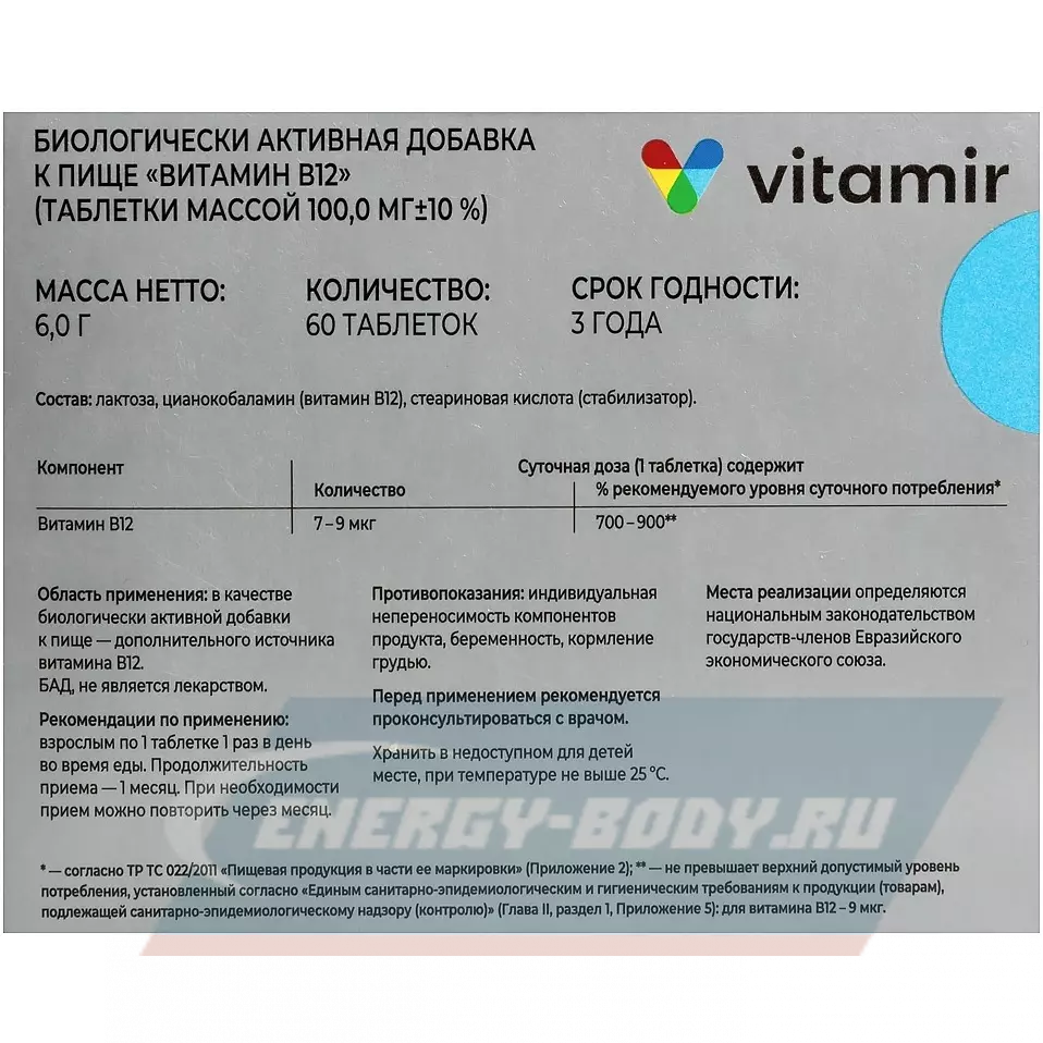 ВИТАМИР Витамин B12 60 таблеток — Поддержка нервной системы и улучшение памяти