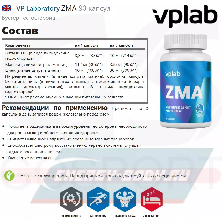Эти микроэлементы теряются во время интенсивных физических нагрузок и чтобы восполнить необходимые запасы организма достаточно одной капсулы ZMA в день.
