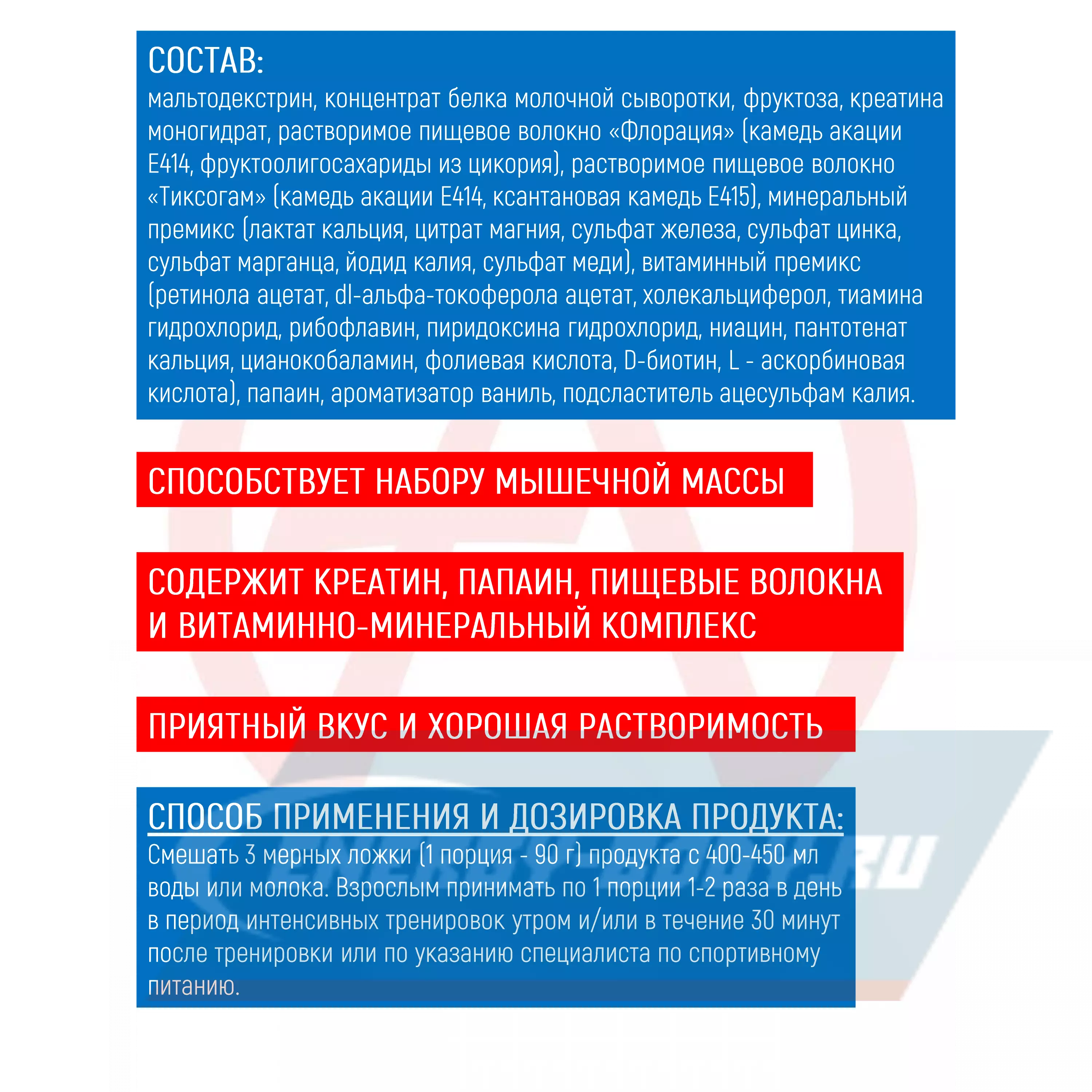 В дни тренировок для приготовления разовой порции смешайте 3 мерные ложки (90 г) продукта с 400 – 450 мл воды или молока. Принимайте 1-2 раза в день: утром – во время завтрака и/или в течение 30 минут после физических нагрузок.