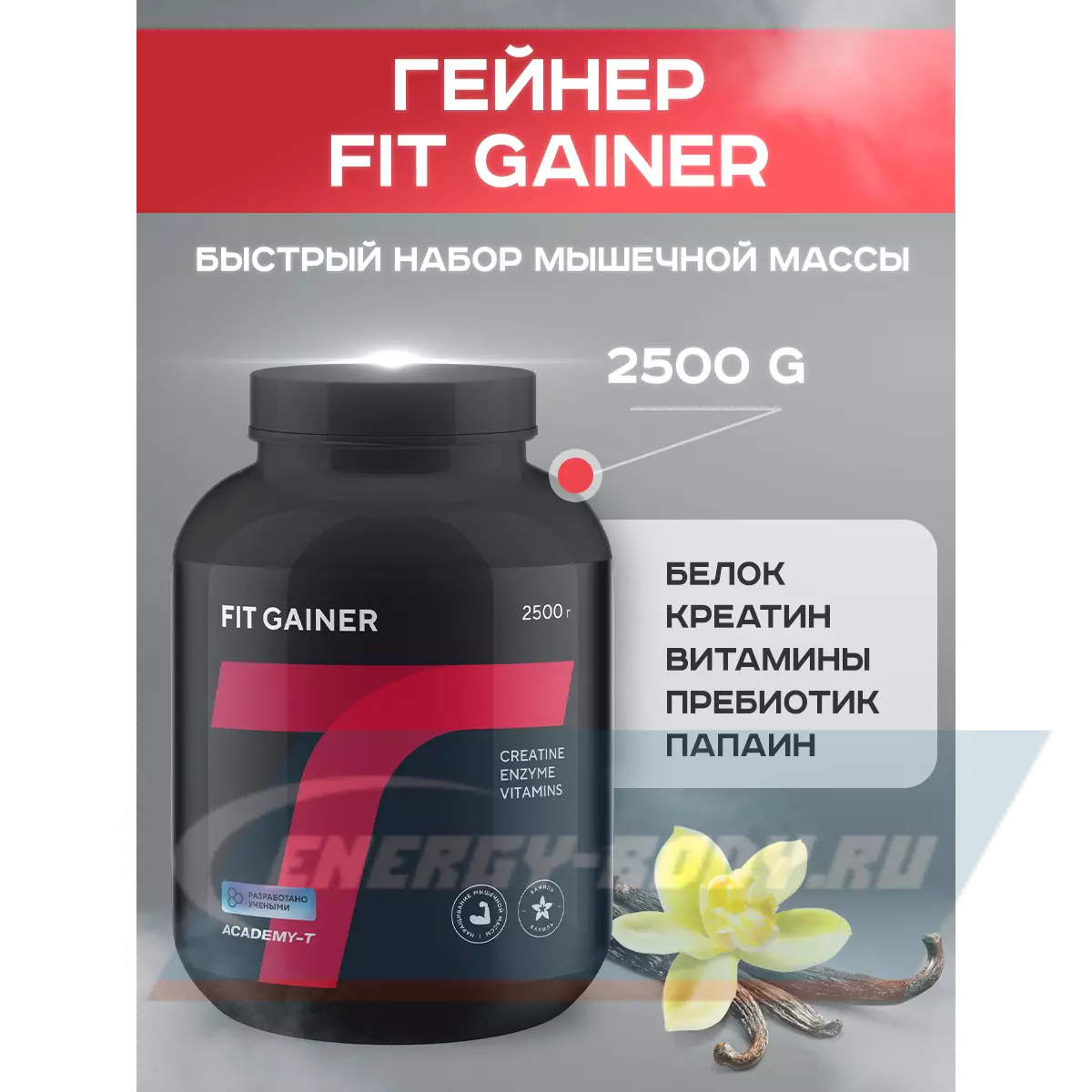 «FIT GAINER» включает в себя сбалансированный белковый комплекс, углеводы с пищевыми волокнами (в сумме дающие быструю и долговременную энергию), креатин и папаин (фермент который улучшает усвояемость белка), а также специально разработанный витаминно-минеральный профиль, оптимизирующий энергетику, усвоение и обмен веществ.