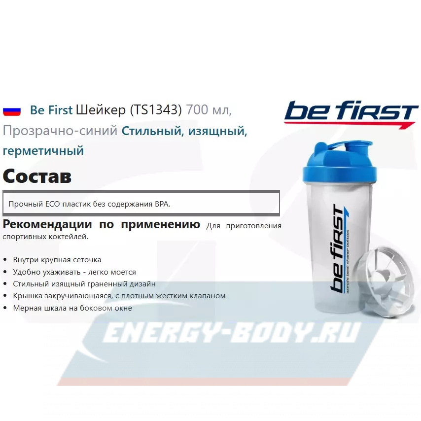 Замечательный стильный спортивный шейкер от Be First на 700 мл для приготовления спортивных коктейлей. Шейкер довольно изящный, даже не скажешь, что в нем помещается целых 700 мл. Треугольные прозрачные грани на корпусе и грани на крышке придают шейкеру оригинальный вид. Крышка закручивающаяся, имеет круглый небольшой носик, очень плотно закрывающийся жестким клапаном. Внутри — крупная сетка с петлей для захвата и наклонными лопастями, прекрасно перемешивающими коктейль. Сбоку на корпусе пластикового шейкера имеется окно, на котором нанесена мерная шкала. Держать шейкер в руках удобно и приятно. Внутри на корпусе нет никаких выступов, так что моется шейкер также легко и приятно. Выполнен из пищевого ECO пластика.