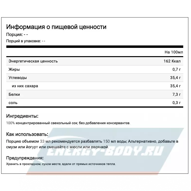 Ингредиенты: 100% концентрированный свекольный сок; без добавления консервантов.