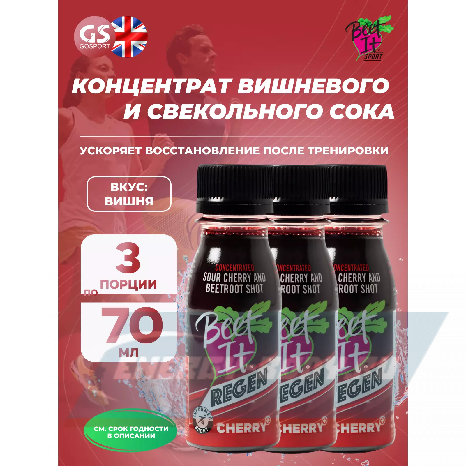 - Шоты Beet It Regen Cherry+ содержат концентрат вишневого сока (58%) и концентрат свекольного сока (42%) в удобном готовом к употреблению формате объемом 70 мл.