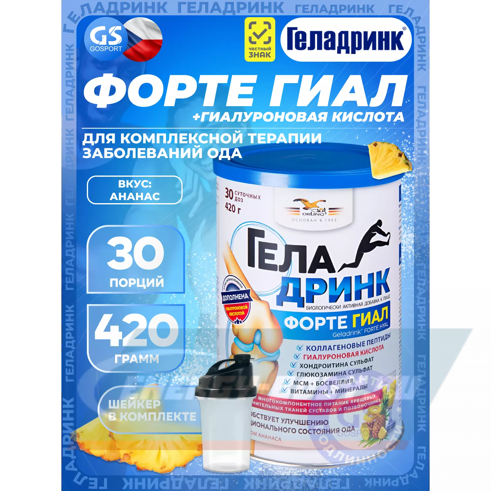 ГЕЛАДРИНК ФОРТЕ (Geladrink Forte) ГИАЛ + Шейкер 420 г + шейкер, Ананас — Для подвижности и гибкости суставов