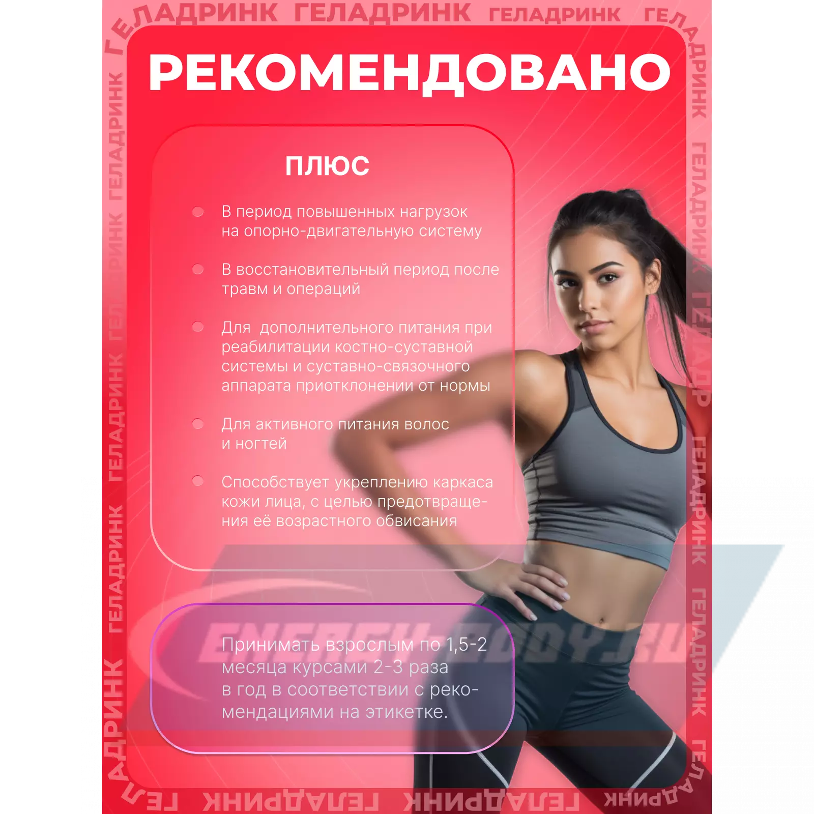 Геладринк Плюс выполняет функцию питания и защиты хрящевой ткани, восстанавливает обменные процессы, стимулирует синтез естественного коллагена. Дополнительный эффект от приёма – улучшение состояния кожи, волос и ногтей. Не содержит сахарозу, холестерин, клейковину, лактозу.