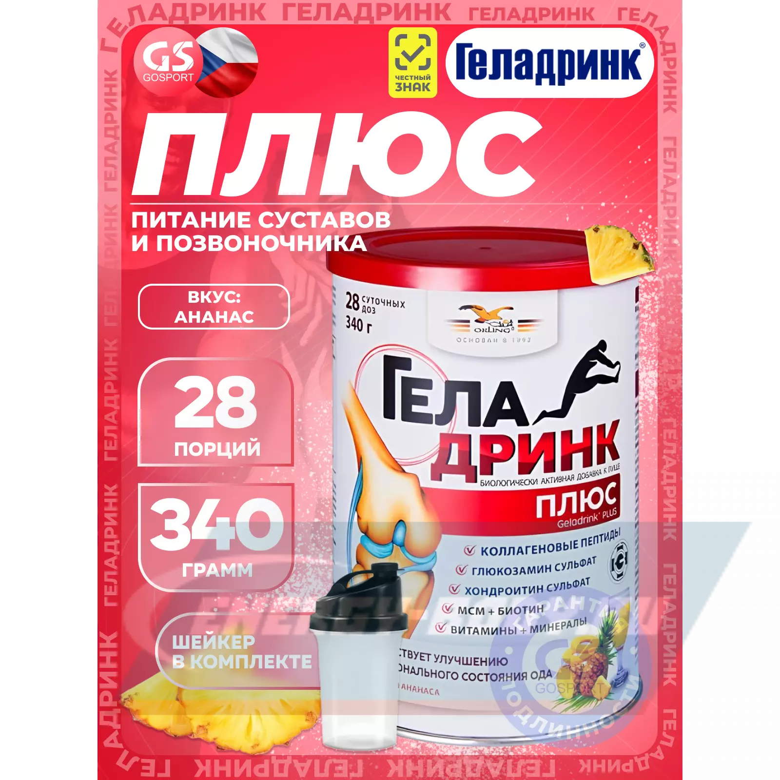 ГЕЛАДРИНК Плюс (Geladrink Plus) + Шейкер 340 г + шейкер, Ананас — Для опорно-двигательного аппарата