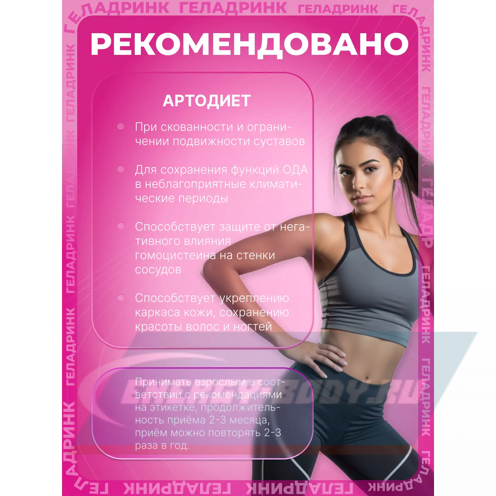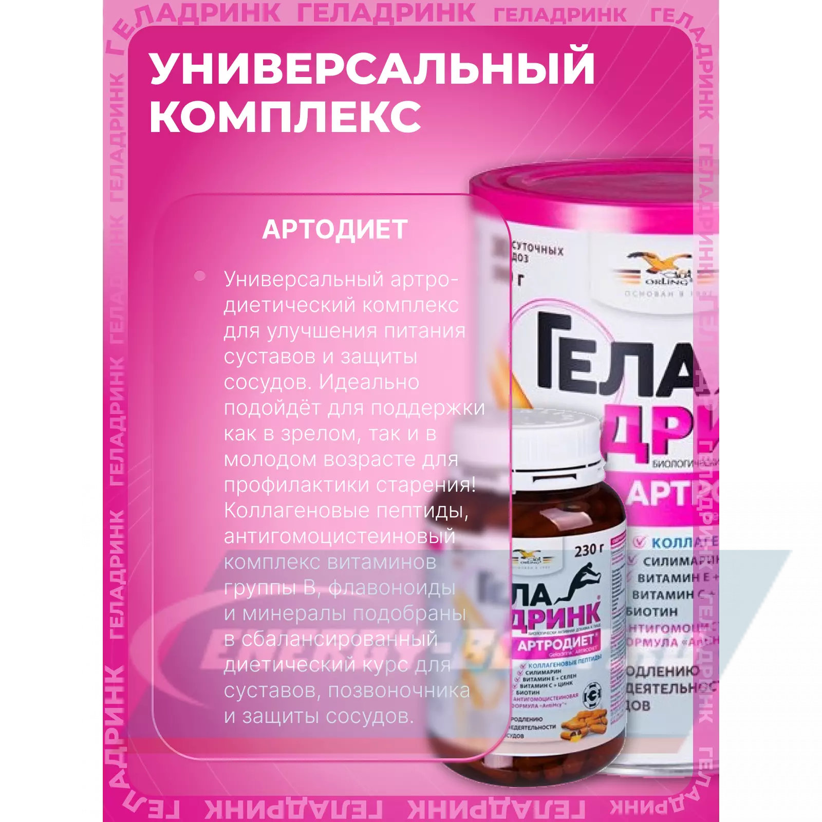 Геладринк® Артродиет® («Geladrink® Artrodiet®») содержит оптимальный комплексный состав для питания суставов, позвоночника и сосудов и продления их активной жизнедеятельности. Область применения: в качестве биологически активной добавки к пище, содержащей коллаген, дополнительного источника витаминов (С, В6, В12, Д3, Е, фолиевой кислоты, биотина), селена, цинка, источника флавоноидов.лее клинические исследования, табличка с составом и описание состава.