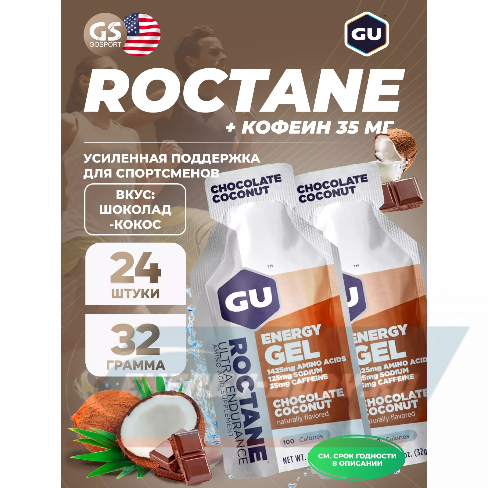 GU ENERGY GU ROCTANE Energy Gel 35mg caffeine 24 x 32 г, Шоколад-Кокос — Для выносливости и водно-солевого баланса