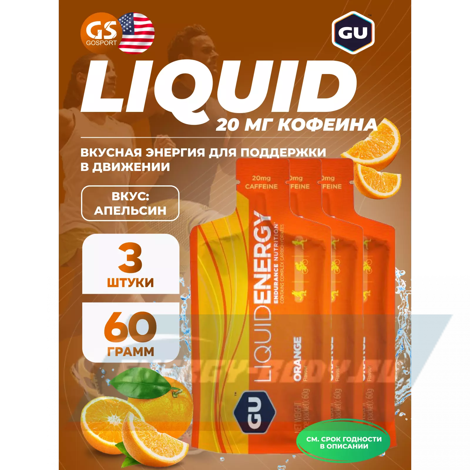 GU Liquid Enegry Gel 20mg caffeine 3 саше x 60 g, Апельсин