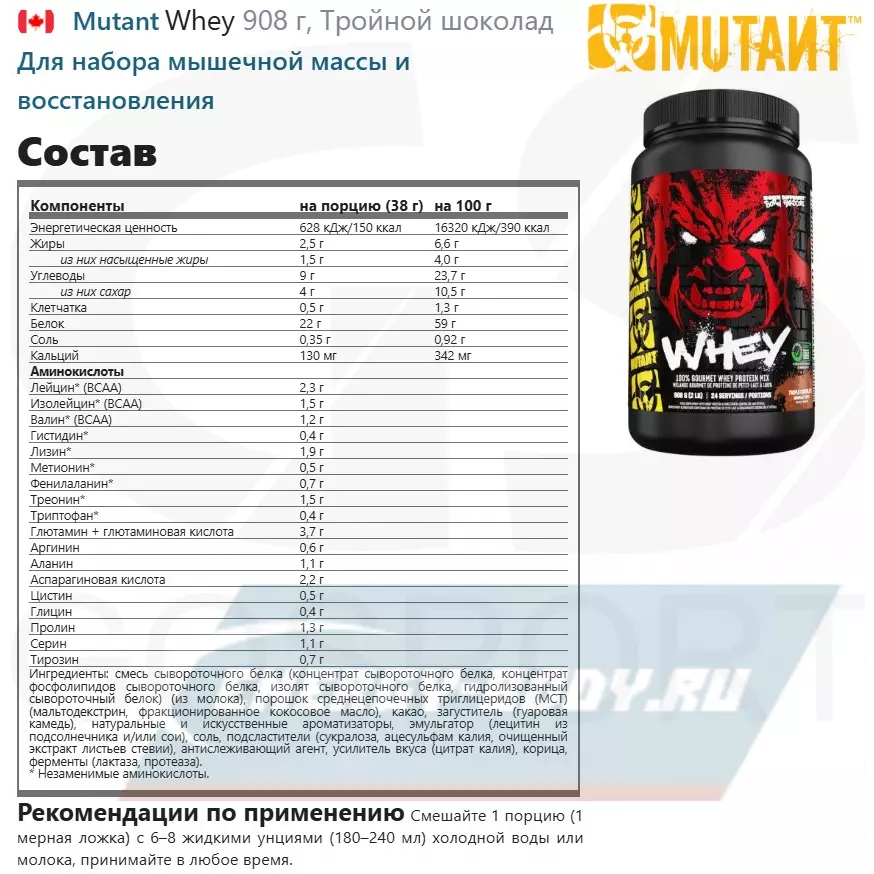 Mutant Whey 908 г, Тройной шоколад — Для набора мышечной массы и восстановления