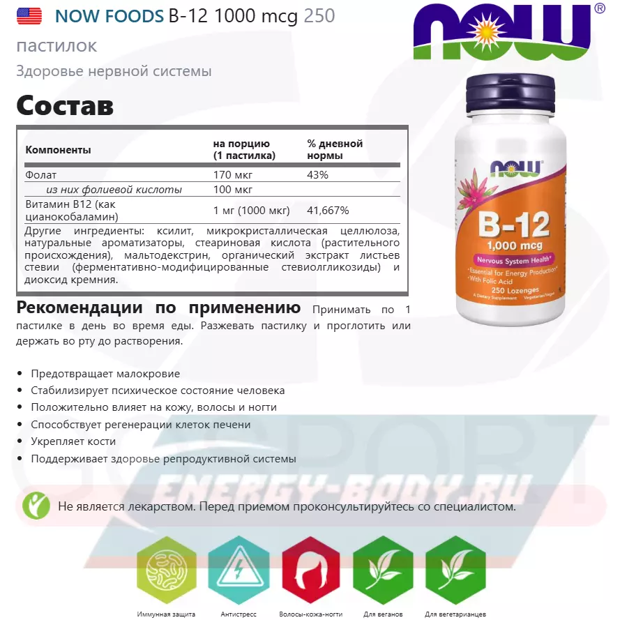 Состав NOW FOODS B-12 1000 mcg