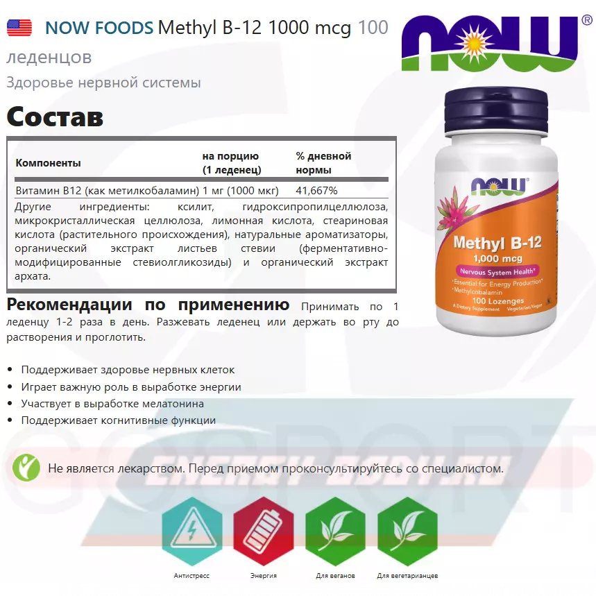 Состав NOW FOODS Methyl B-12 1000 mcg