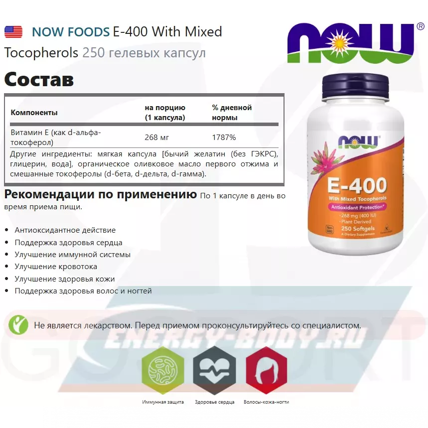 Состав NOW FOODS E-400 With Mixed Tocopherols