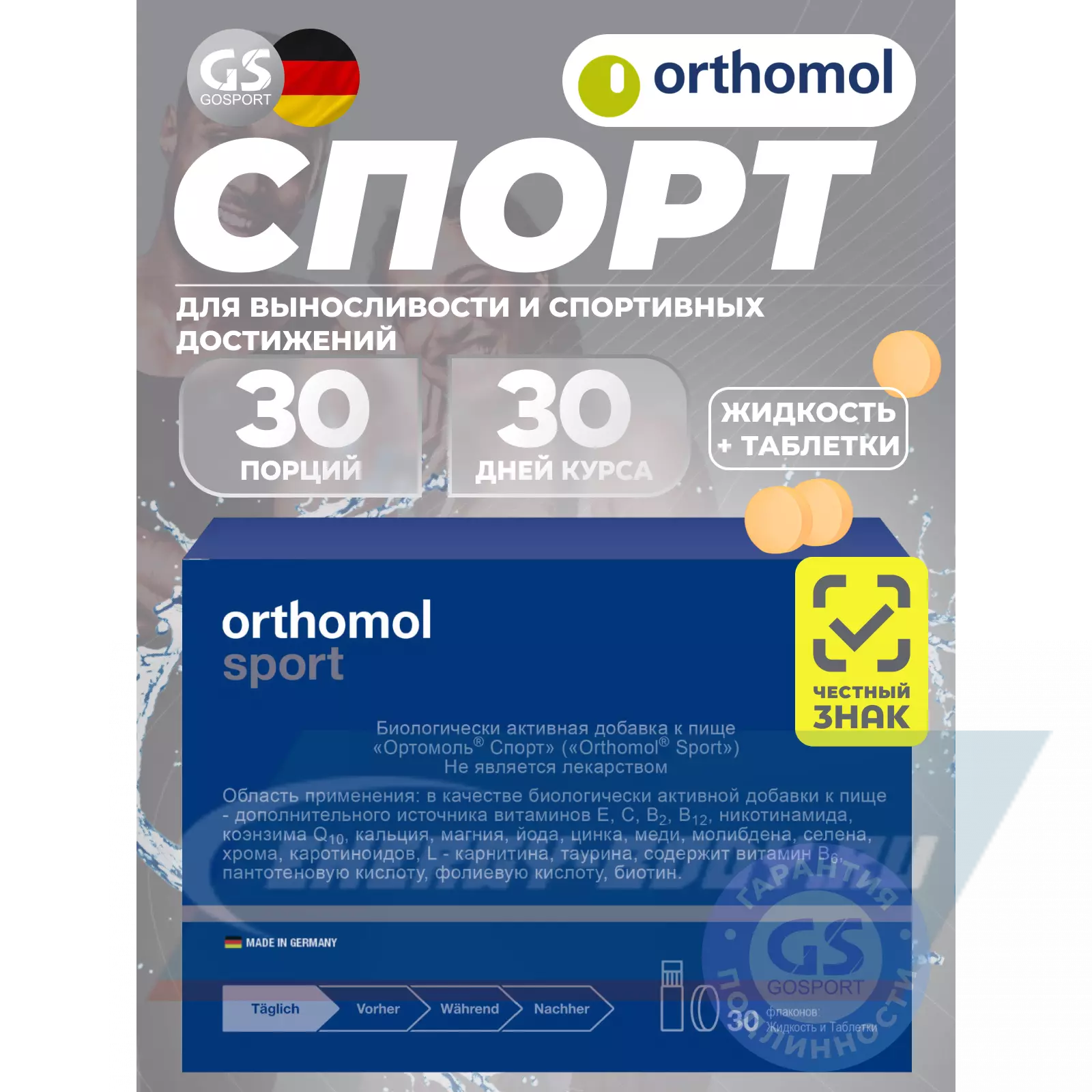 Важные указания: Orthomol Sport — это ортомолекулярный препарат для профессиональных спортсменов или людей, которые регулярно подвергаются существенным физическим нагрузкам. Принимать витаминный комплекс можно только под наблюдением врача. Не является заменой пище.