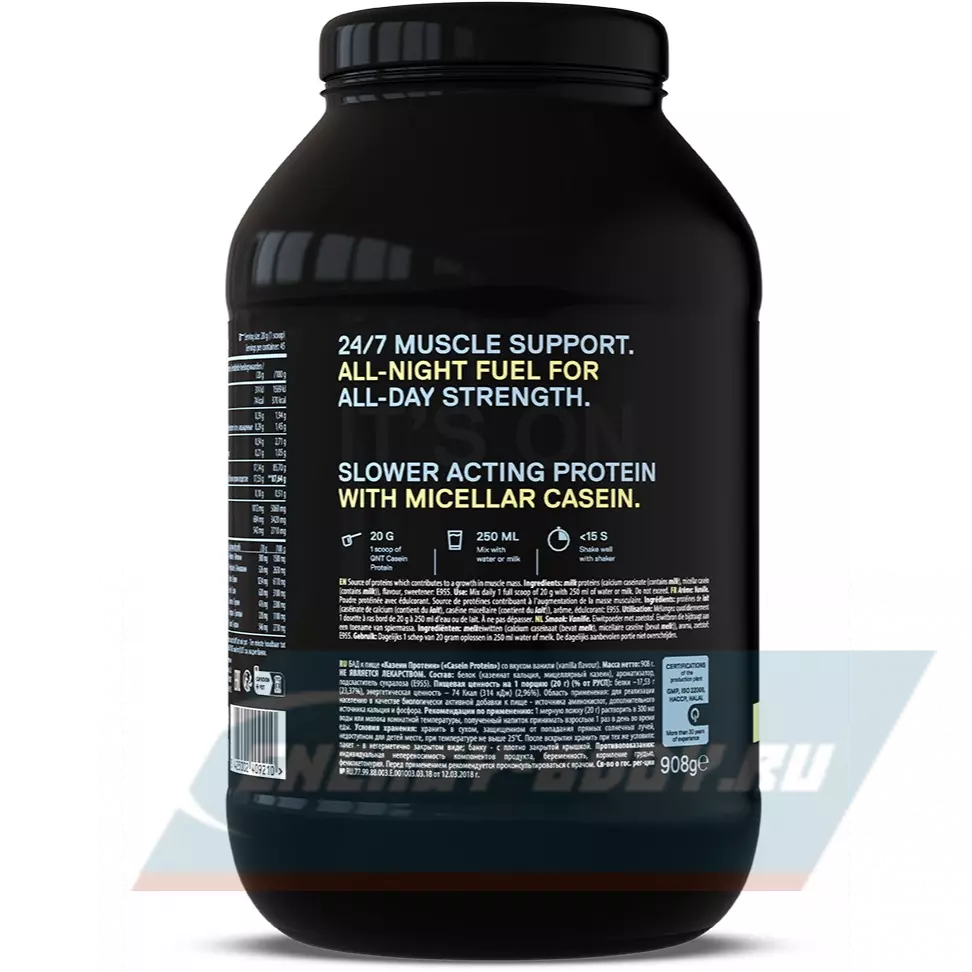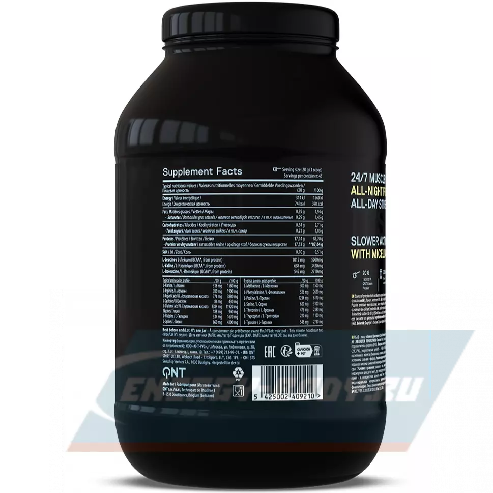 QNT CASEIN представляет собой смесь мицеллярного казеина и казеината кальция. Эта формула обеспечивает белок, который сохраняет все биологические свойства с превосходным аминокислотным профилем, включая высокую концентрацию BCAA.