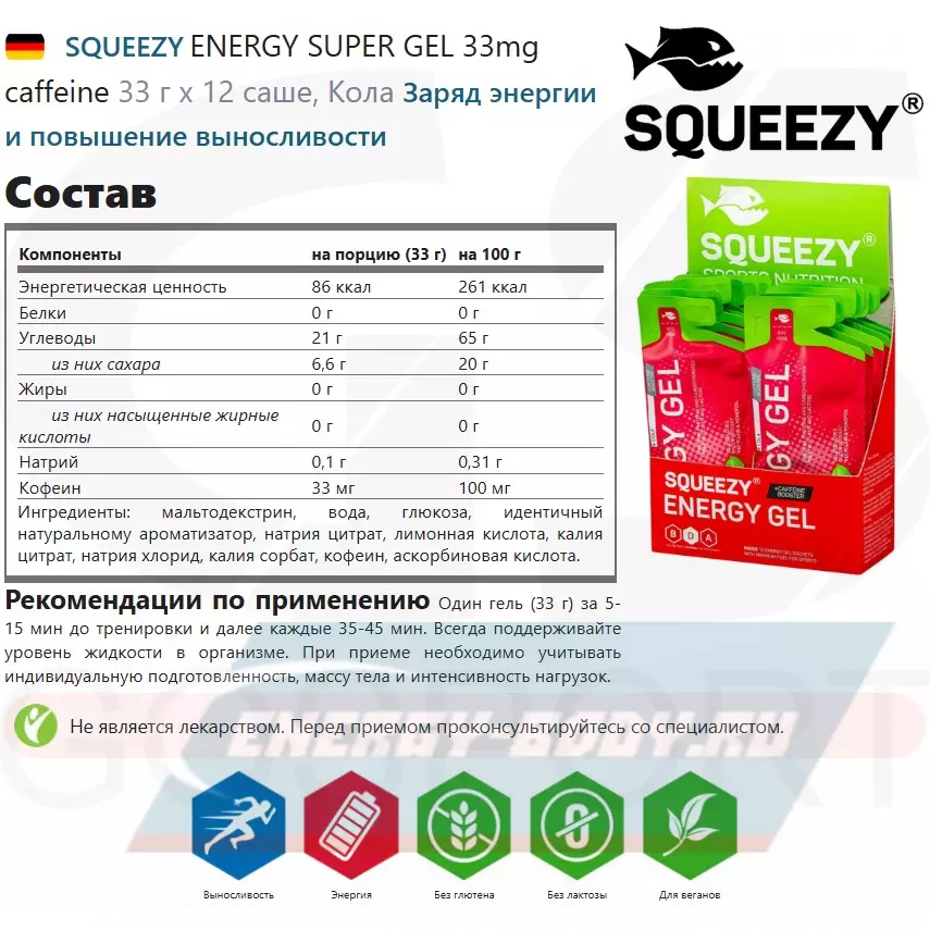 Состав SQUEEZY ENERGY SUPER GEL 33mg caffeine