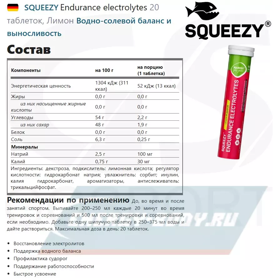 SQUEEZY Endurance electrolytes 20 таблеток, Лимон — Водно-солевой баланс и выносливость