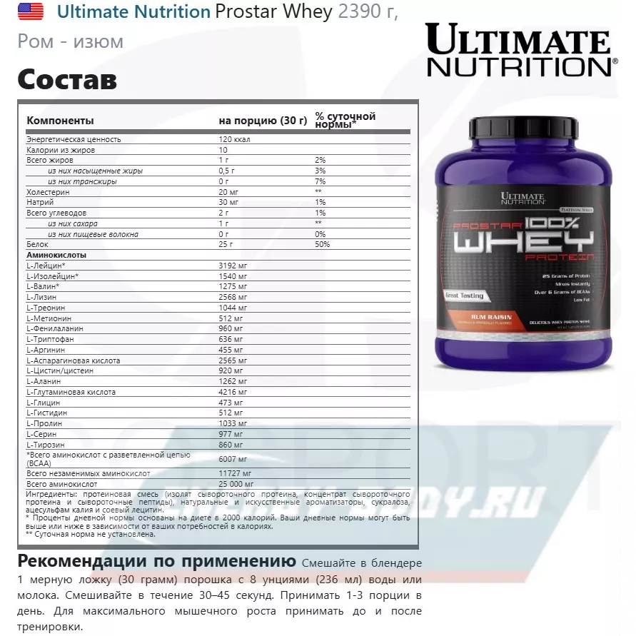 Для удовлетворения потребностей спортсменов компания Ultimate Nutrition разработала продукт 100% Prostar Whey Protein с содержанием всего перечня заменимых и незаменимых аминокислот, необходимых для строительства вашей мускулатуры как при длительных, так и непродолжительных интенсивных нагрузках. 100% Prostar Whey Protein – это уникальное сочетание всех питательных веществ, включая фактор иммунного роста, получаемый с использованием специальных процессов из сывороточного белка. Поскольку упражнения могут нанести урон вашей иммунной систем, 100% Prostar Whey Protein выбор тех, кто придерживается активного образа жизни, независимо являетесь ли вы любителем или профессионалом.